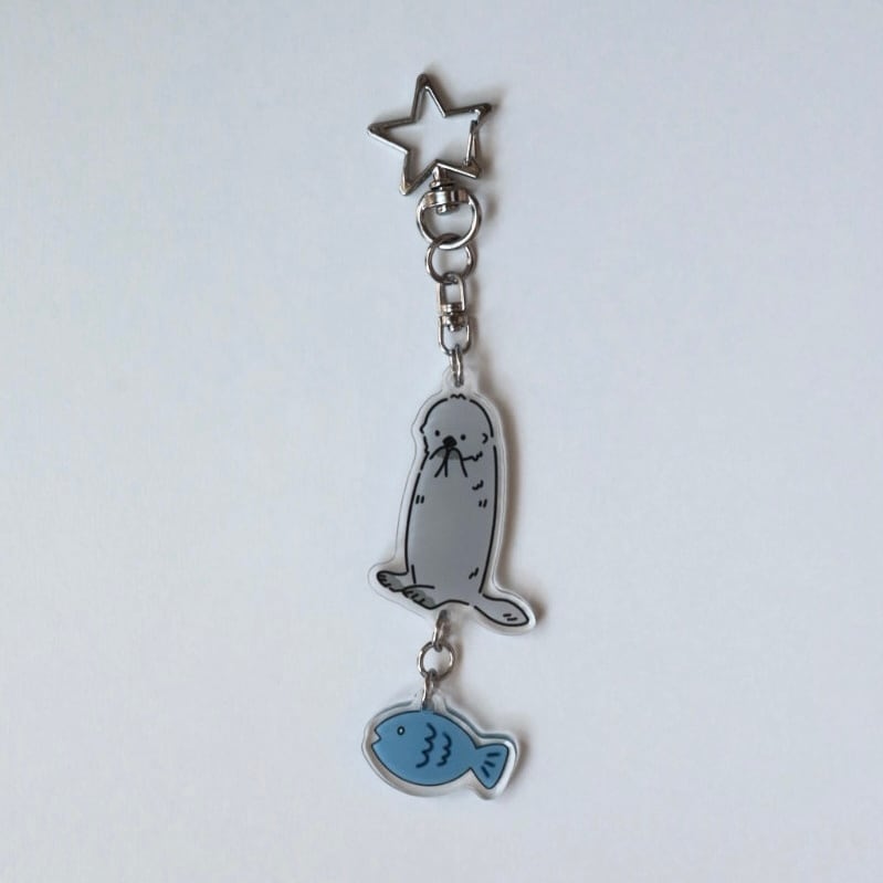 立ち上がったラッコと魚の二連のアクリルキーホルダーです。